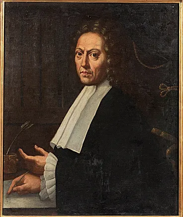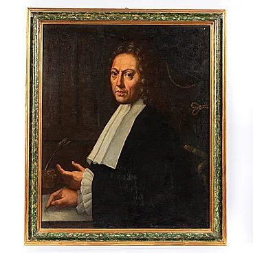 Oil painting on canvas, canvas size 88x73 cm, frame size 102x86 cm - Portrait of a magistrate. The subject is depicted in a half-bust pose at a table, holding a quill pen in his right hand. In the upper left, there is a window with bars and law volumes. The man is dressed in a dark suit with a wide white collar, typical of 17th-century fashion. The painting is set in a beautiful and well-crafted gilded and green Salvator Rosa-style frame, which is from a period later than the painting itself. Italian school, dating from the late 1600s to the early 1700s. The painting shows a relining and does not reveal any particular pictorial restorations under a Wood's lamp. Comes with a certificate of authenticity.