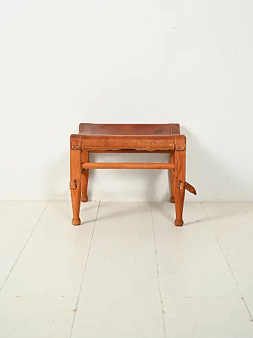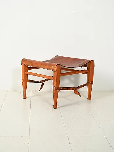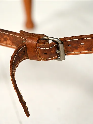 “Safari” model footstool from the 1960s, with solid structure in turned oak and crosspieces reinforced by leather straps. The suspension seat in cognac-colored leather shows contrasting handcrafted stitching and a pleasant vintage patina. Original metal details and tension ties testify to the quality and functionality of the project. Good condition. It may show some signs of aging. Please pay attention to the photographs.