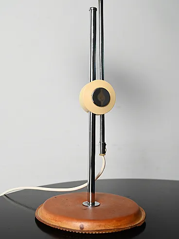 “Simris” table lamp with chromed metal structure, leather-covered base, sliding trolley with adjustment knob, design 1964.