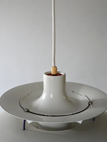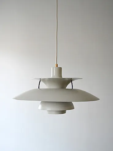 Designed by Poul Henningsen for Louis Poulsen, the PH5 chandelier has a painted metal structure with a diffuser with overlapping plates. designed to shield glare and distribute light evenly. Matte white finish with red and blue internal details that modulate the luminous tone, generating a warm glow and pink nuances. Icon of Scandinavian design, essential and elegant.