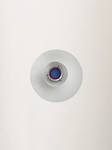 “PH 5” ceiling lamp designed by Poul Henningsen for Louis Poulsen, white metal, with red and blue inserts.