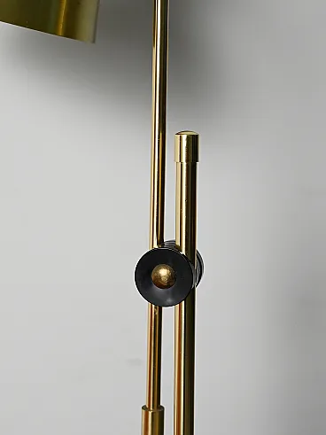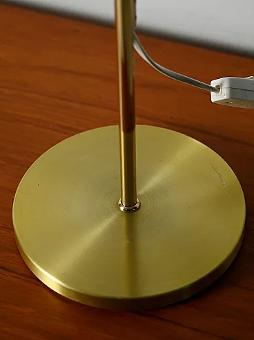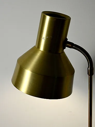 Scandinavian table lamp attributed to EWÅ, Värnamo, dating from the 1960s. Metal structure with satin gold finish: round weighted base, vertical stem with friction slider and arm adjustable in height and projection. The terminal has a flexible neck that allows the orientation of the hat, with a conical-cylindrical shape typical of Nordic production of the period. There are some small marks on the top of the hat.