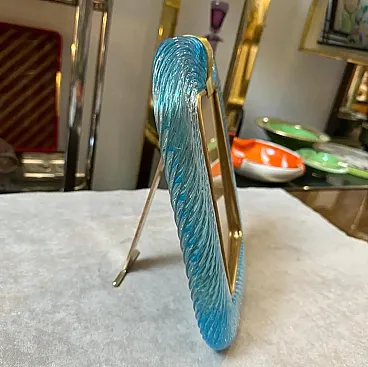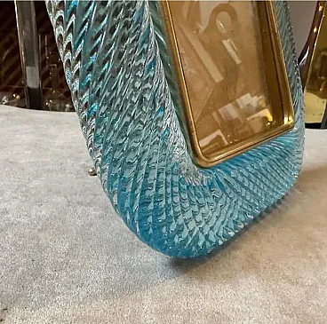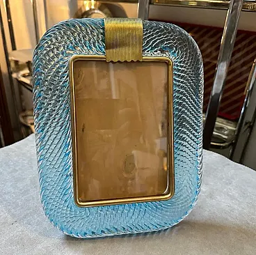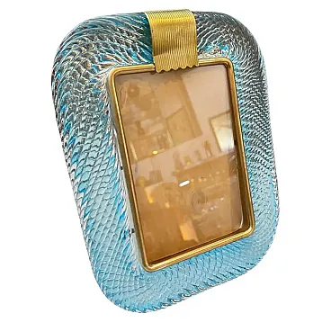 A light blue Murano glass picture frame designed and manufactured in Venice in the style of Barovier in lovely condition. The vintage photo frame is a beautiful and elegant piece of decor that is perfect for displaying your favorite memories in style. Barovier is a renowned Italian glass-making company that has been in operation since 1295, and its products are highly valued by collectors and design enthusiasts alike. The photo frame features a rectangular shape with a solid brass clean internal frame. The outer part of the frame is made of turquoise Murano glass, carefully crafted by skilled artisans, with each piece being unique due to the nature of the glass-making process. This photo frame is a perfect example of the Art Deco style that was popular in the early 20th century, characterized by bold geometric shapes, sleek lines, and a focus on luxury and craftsmanship, it is a timeless piece that will add elegance and sophistication to any room