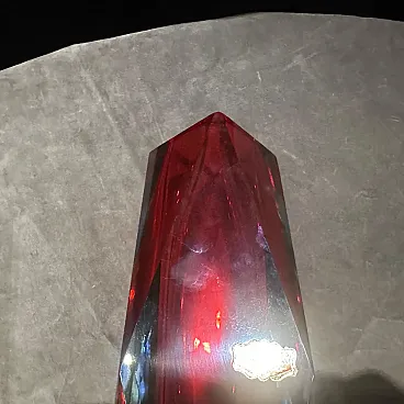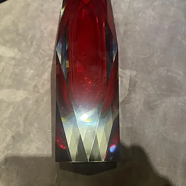 A Red and yellow Sommerso Murano glass vase designed and manufactured in Italy in the Seventies, the multifaceted style was very popular in Murano in that period, is a stunning example of Italian craftsmanship and design from that era. The vase features a faceted design, characterized by sharp angles and clean edges, giving it a contemporary yet timeless appeal. The facets catch and reflect light, creating a mesmerizing play of colors and shadows that enhance the visual interest of the piece. The rich red hue of the glass adds a bold and refreshing touch to any space, evoking a sense of vitality and natural beauty. This vase serves not only as a functional vessel but also as a striking decorative accent. Whether displayed on its own or filled with flowers or foliage, it becomes a focal point in any room, adding a touch of sophistication and elegance to the surroundings. It's in excellent vintage condition, any chips or cracks on the glass.