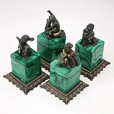 Group of four silver sculptures depicting playful scenes of children with animals. Malachite plinth base. Silver hallmarks incised under the base. Unrecognizable silversmith\'s mark. Approximately 440 grams.