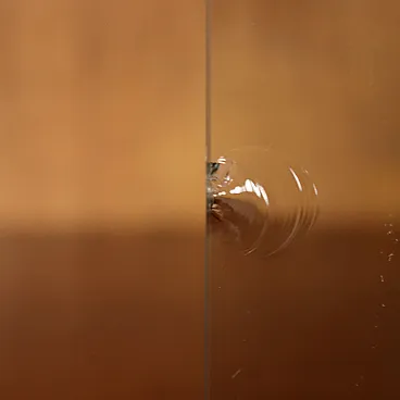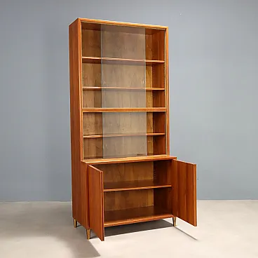 Larch veneered storage unit with brass accents, featuring a display case and hinged doors. In good overall condition, with some chipping on the glass, as shown in the photos.