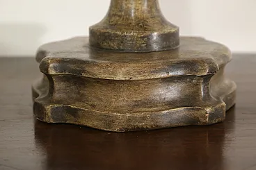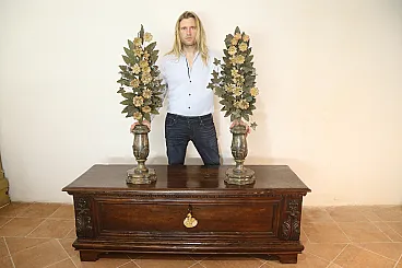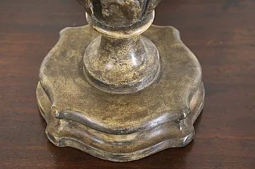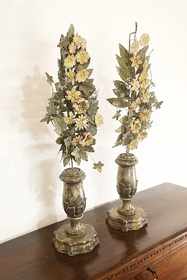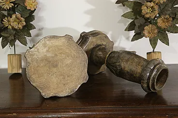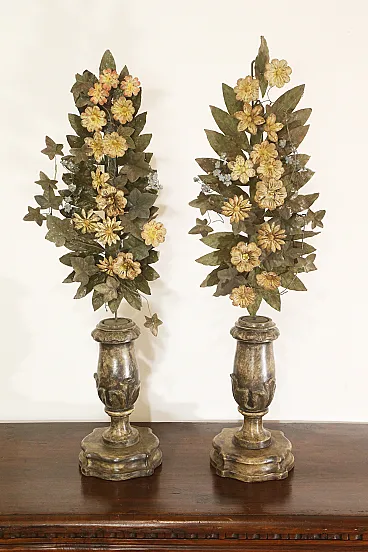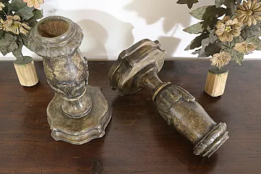 Realizzati in legno intagliato e argentato, questa coppia di porta palme faceva sicuramente parte di un ornamento da altare di qualche chiesa.