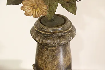 La base dal profilo mosso tipico del periodo barocco sorregge il vaso adorno di foglie d'acanto.