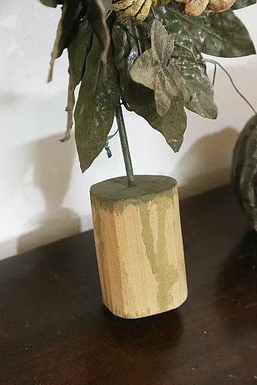 Le palmette, realizzate in ferro sbalzato e tinto non sono coeve ma risalgono agli anni 10/20 del 900, sono montate su basamenti in legno di ciliegio che si alloggiano perfettamente nel imbocco dei porta palme.