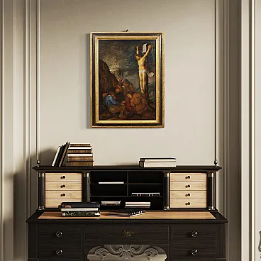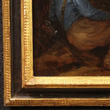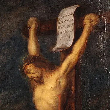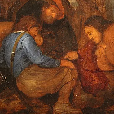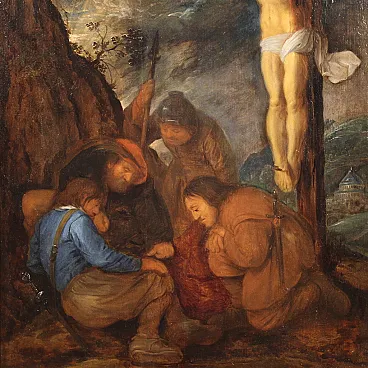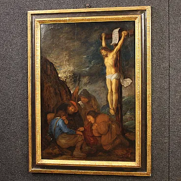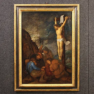 Ancient Flemish painting from the 17th century. Oil painting on panel depicting the biblical scene of Christ's tunic being played by lot. The soldiers, when they had crucified Jesus, took his clothes and played dice at the foot of the cross. The work was attributed by the art historian Fred Meijer, an expert on Dutch art, to the Flemish painter known under the name "Monogrammist H.C."