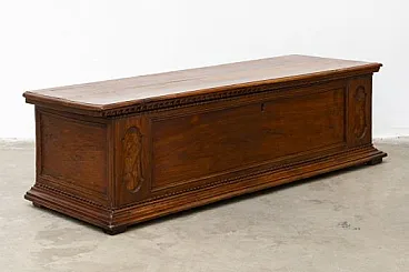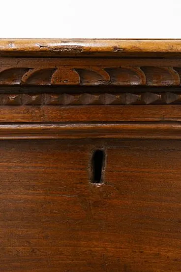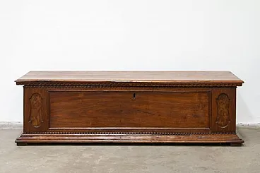 The base of the chest consists of a larger cornice and rests on two retractable feet. Two hinges support the lid: one contemporary, the other (left) more recently made