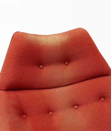 The supporting structure is a fiberglass monocoque that rests on a rotating tulip base. The padding is made of polyurethane foam, covered in original orange-red fabric