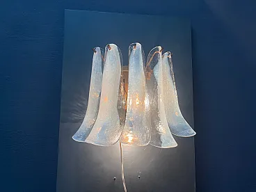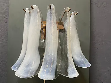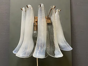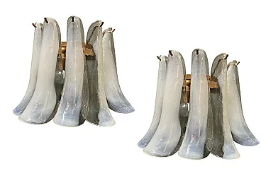 Murano Glass Sconces, Set of 2 This elegant pair of hand-blown Murano glass sconces features elongated glass elements and soft white tones, with subtle variations characteristic of traditional craftsmanship. Their sculptural, petal-like shapes create a delicate diffusion of light, adding warmth and sophistication to any interior. Each wall light is mounted on a brass frame and has been recently rewired to ensure full compatibility with EU, UK and US electrical standards. Dimensions - Height: 27cm - Width: 36cm - Depth: 14cm Details - Set of 2 - Hand-blown white Murano glass - Newly installed wiring - Compatible with EU / UK / USA