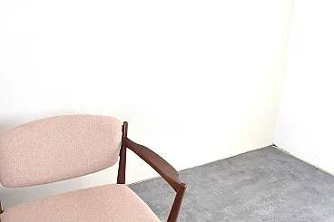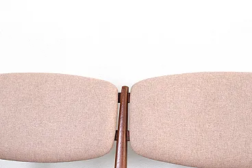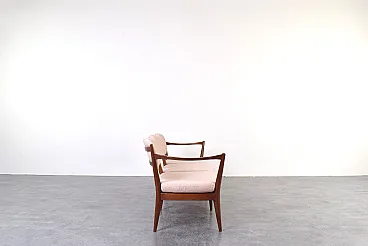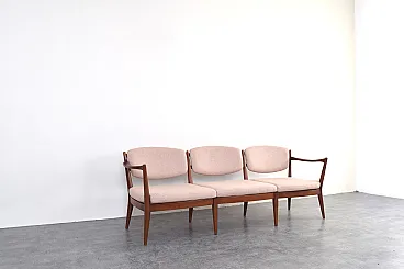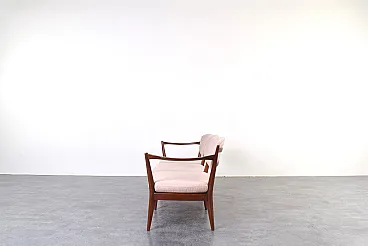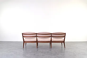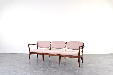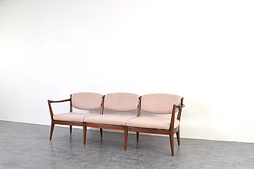 This three-seater "Kaminstolen" sofa was designed in the 1950s by Norwegian designers Fredrik Kayser and Adolf Relling and manufactured by Arnestad Bruk. The sofa's frame is made of teak and has been professionally and carefully restored by removing old coatings, staining and finishing with varnish. The restoration was carried out by a talented and experienced carpenter with over 20 years of experience. The seat and back cushions have been reupholstered in a beige and powder pink color fabric made from recycled wool. Thanks to these treatments, the desk looks beautiful and will serve its new owner for many years without fear of damage or wear from everyday use.