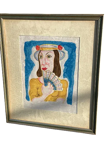 The print features a rich color palette, with overlapping yellows, blues and reds that create an energetic but balanced composition. The woman with a fan, suspended on a vibrant background, is an emblematic subject of his most lyrical production.