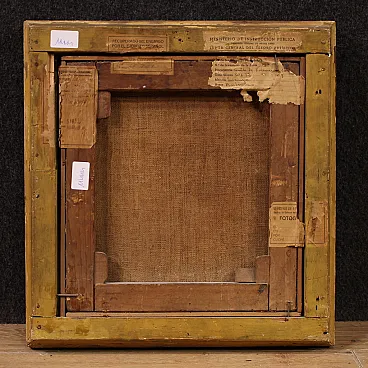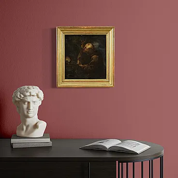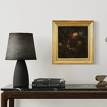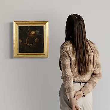 Ancient Spanish painting from the second half of the 17th century. Oil on canvas work depicting Saint Francis of good pictorial quality. Painting adorned with a beautiful carved and gilded wooden frame from the 19th century. A small work, for antique dealers and collectors of ancient sacred art. On the back there are some historical references linked to the events and revolutions that took place in Spain during the 20th century (see photo). Painting in beautiful patina, to be cleaned for better enjoyment, with some small signs of color pick-up and a small drop of color in the upper part (see photo). Overall, it is in a good state of conservation. Painting light H 30.5 x W 28.5 cm.