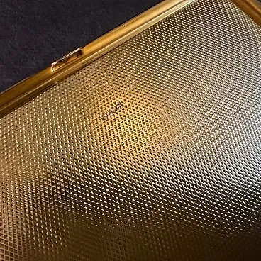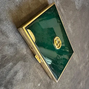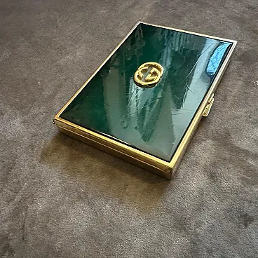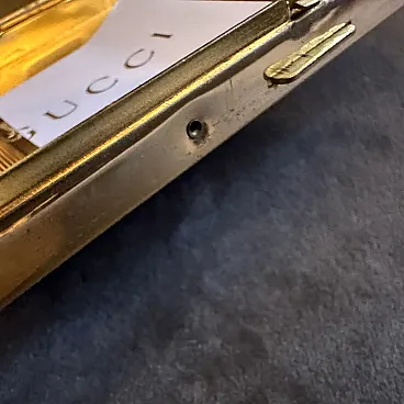 This is a captivating, elegant piece of 1980s Gucci Florence craftsmanship. This Vintage Cigarette or Card Case is a fantastic example of the luxury accessories the brand was known for. The exterior features a sleek, sophisticated deep forest green enamel finish, which provides a striking contrast to the polished gold-plated brass frame. At the center of the lid is the unmistakable interlocking GG logo in raised gilt brass, a timeless symbol of luxury and heritage. When opened, the case reveals a clean, high-polish gold-tone metal interior with a fine, textured guilloché pattern on both sides, stamped subtly with the "GUCCI" signature, confirming its authenticity. The interior is fitted with the original functional retaining bar to securely hold cigarettes, business cards, or small keepsakes. Its slim, portable design makes it a stylish vintage statement accessory, perfect for the collector or as a chic, repurposed small clutch or cardholder. The visible wear on the enamel on the surface tells the story of a well-loved and used vintage piece, adding to its character and history. It's in good vintage condition.