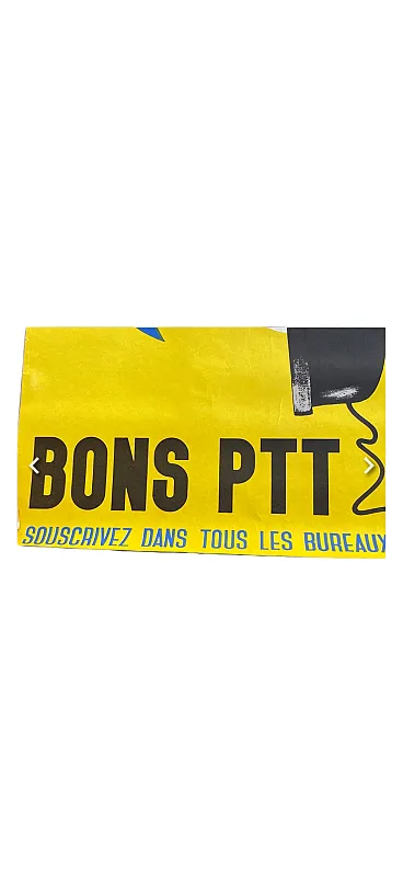 Stunning original French advertising poster entitled “BONS PTT”, created by the famous artist Raymond Savignac (signature visible on the right). This poster is an icon of post-war French advertising graphics, designed to promote the purchase of PTT bons (government bonds issued by the French Post Office, Télégraphes et Téléphones).