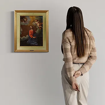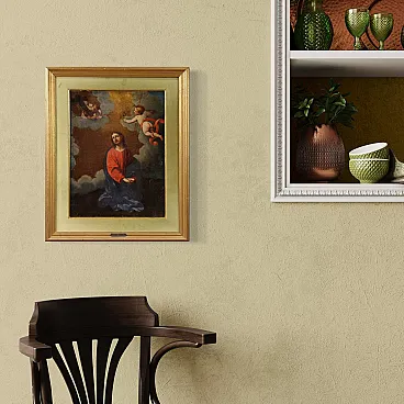 It has a plate on the front that attributes it to the famous Bolognese painter Marcantonio Franceschini (1648-1729), lacking additional documentation. The setting of the painting and the figure of Christ are very close to the famous painting Christ in the Garden of Gethsemane by Guido Reni's circle. The painting does not currently have art historian expertise which can be requested at the time of purchase (cost of the service not included in the price, contact us to receive a quote).