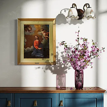 Ancient Italian painting from the late 17th, early 18th century. Oil on canvas work depicting Christ with angels and symbols of the passion of excellent pictorial quality. Painting adorned with a modern carved and gilded wooden frame with velvet passe-partout. Small-sized painting, for antique dealers and collectors of ancient sacred art.