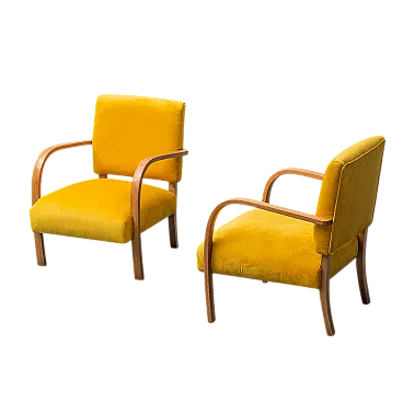 Pair of armchairs in yellow velvet and wood, 1950s 1