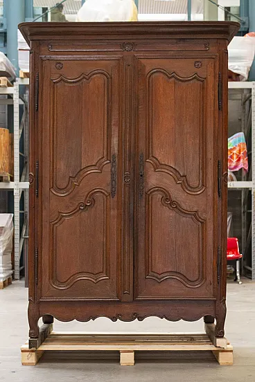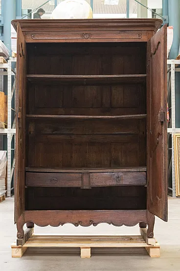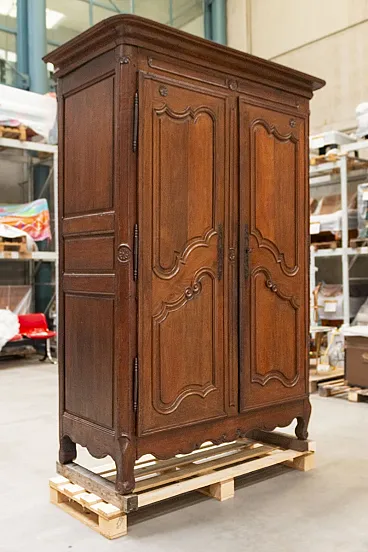 Made of Louis XV style oak wood, with typical 18th century decorations, "S" feet and carvings on the doors and upper part. Entirely interlocking with wooden nails, no assembly with glues or metal nails, a typical technique of the time that enhances its value. For this reason in the backrest, between one axle and another, there are some cracks, completely normal and due to the construction technique
