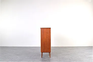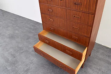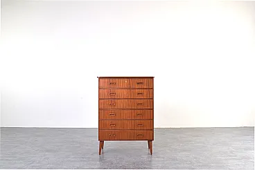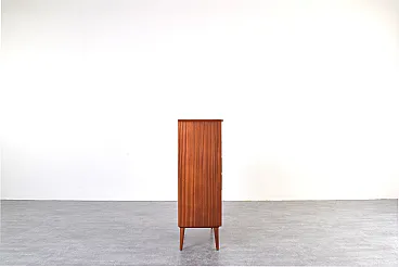 This teak chest of drawers was manufactured in Denmark in the 1960s. The furniture has been professionally and carefully restored by removing old coatings, staining and finishing with varnish. The restoration was carried out by a talented and experienced carpenter with over 20 years of experience. Thanks to these treatments, the desk looks stunning and will serve its new owner for many years without fear of damage or wear from everyday use.