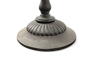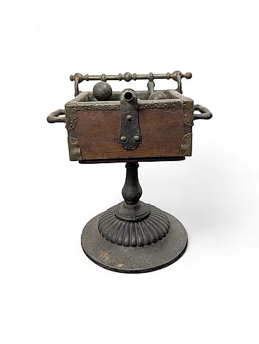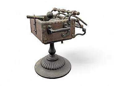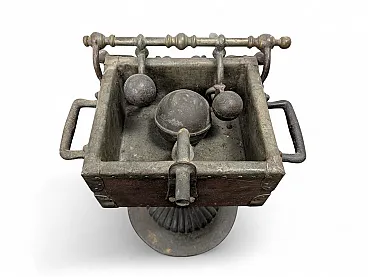 This fascinating oenological instrument from the late nineteenth century represents a valuable example of mechanical engineering applied to the historic cellar. The object has a quadrangular well structure in solid wood, finely reinforced by corners and profiles in riveted metal which guarantee its structural solidity. The main body rests on an elegant cast iron column base with a knurled circular foot, which gives stability and a decorative touch typical of the industrial aesthetics of the time.