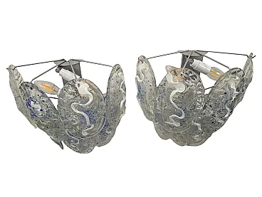 This splendid pair of Murano glass wall lights represents a refined example of Venetian craftsmanship, characterized by a sculptural and organic design. Each lamp is composed of a fan-shaped metal structure on which elliptical hand-blown glass elements are set, arranged on several levels to create an evocative effect of depth and movement.