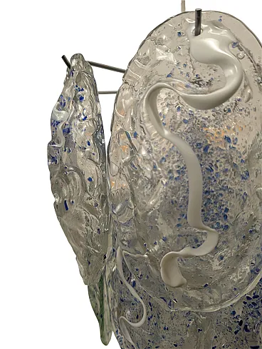 The transparent glass is enriched by an artistic workmanship that includes inclusions of blue grit and delicate drips of milky white glass that draw abstract and sinuous patterns on the surface. The irregular texture of the glass, full of small air bubbles and ripples, diffuses the light in a soft and refracted way, projecting spectacular shadow effects on the walls. Ideal for elegant environments, these wall lights blend the tradition of art glass with a contemporary and vibrant aesthetic.