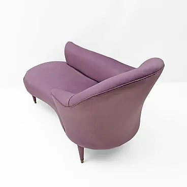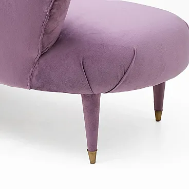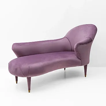 An elegant Italian daybed/chaise lounge, featuring a fluid, sculptural silhouette inspired by mid-century design. The asymmetrical backrest and integrated armrest create a harmonious, enveloping shape that combines comfort and refined aesthetics. Upholstered in a sophisticated antique mauve velvet, the daybed features a soft, matte finish that enhances its elegant profile. The slender, tapered legs, finished with brass sabots, offer a subtle decorative accent while emphasizing the lightness of the structure. Ideal as a statement piece in a living room, bedroom, or refined hotel interior, this daybed embodies timeless Italian elegance and understated luxury.