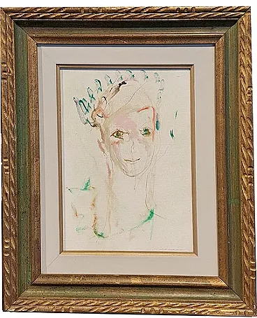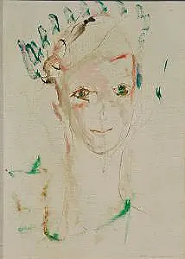 Technique: Mixed media on canvas Subject: Portrait / Female Face Canvas dimensions: 25 x 35 cm (as indicated on the back of the frame) 47 x 57 cm including the frame. Details: The work features the artist's signature on the front (bottom right) and back of the frame ("Treccani"). It is completed by a contemporary frame in worked wood with gold grain and green reflections that enhance its hues. Condition: Excellent overall condition. The canvas and frame are original. Artistic analysis: The work belongs to Treccani's expressive maturity, characterized by a unique poetic lyricism. The face emerges from the canvas through vibrant brushstrokes of green, ochre, and pink, typical of his research into light and human essence. It is not just a portrait, but an evocation of a state of mind, where the "emptiness" of the blank canvas actively participates in the composition, giving modernity and breath to the subject.