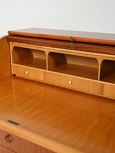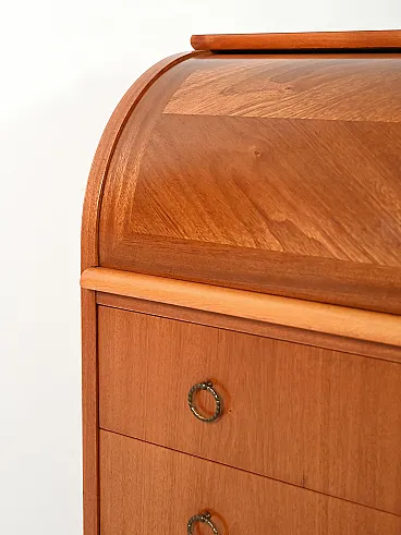 Elegant 1950s Scandinavian writing desk in teak with oak inserts. The sliding roller front hides a desk compartment with small drawers and paper holders; the extractable surface expands the work area. Three spacious drawers with metal ring handles and decorated turned legs complete a classic and proportionate design.