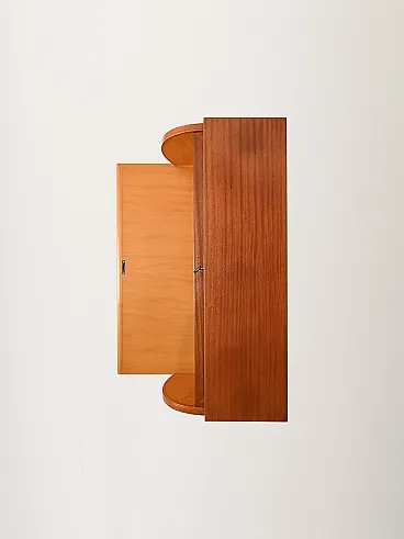 Scandinavian teak secretary with oak inserts, three large drawers, extractable top and roller closure. Decorated turned legs.