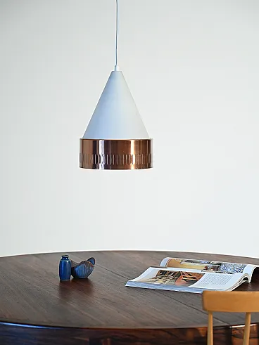 Swedish 60s suspension in the style of Hans-Agne Jakobsson: conical diffuser in opaline acrylic, cylindrical copper crown with vertical slits and internal anti-glare disc. Emission focused on the plane with soft halo; E27 lamp holder, central wiring. Copper band with normal signs of use.