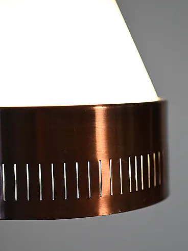 Scandinavian 60s pendant in the style of Hans-Agne Jakobsson, opaline acrylic cone and perforated copper band, direct and diffused light.