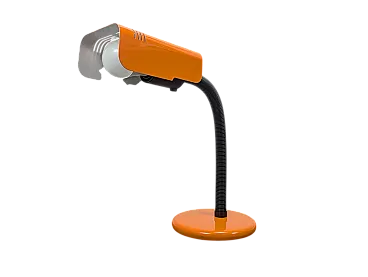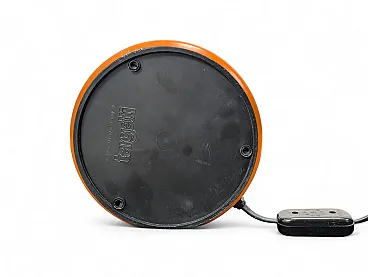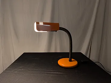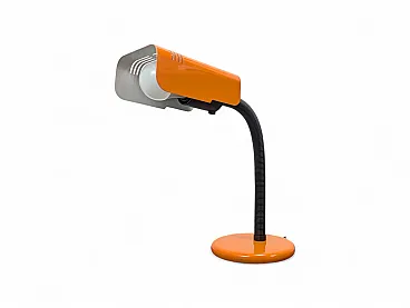 This Targetti table lamp is an icon of 1970s Italian design, characterized by a vibrant and functional Space Age aesthetic. The body is dominated by a vibrant, glossy orange color that covers both the circular base and the adjustable lampshade, the latter featuring a geometric profile and vents at the top for heat dissipation. The structure is made extremely versatile by a long, flexible, black thermoplastic gooseneck stem, allowing the light beam to be directed with pinpoint precision. Made entirely in Italy, as evidenced by the branding imprinted on the bottom of the base, the lamp combines the robustness of period plastic materials with a timeless design, perfect for adding a touch of original modernism to a desk or reading nook.