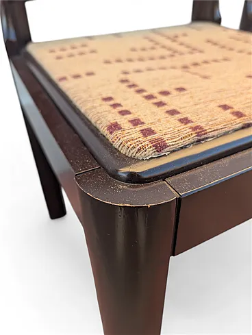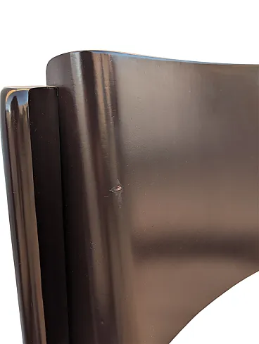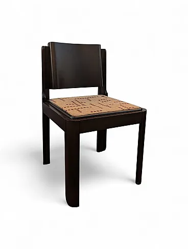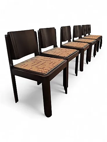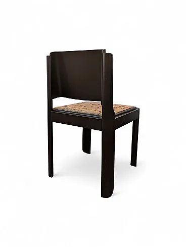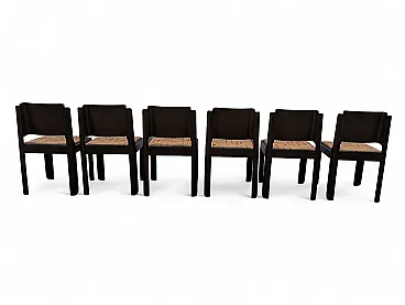 This set of six dining chairs is a refined example of postmodern design with rigorous and geometric lines, characterized by a solid structure in dark brown lacquered wood. The design stands out for the slightly curved backrest that fits between the side uprights with a clean and architectural cut, recalling the style of masters such as Kazuhide Takahama.