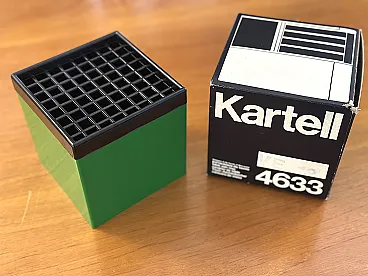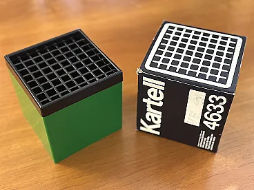 A rare and iconic piece of industrial design, this model 4633 ashtray, produced by Kartell in the 1970s, perfectly embodies the Space Age aesthetic of the era. Designed by renowned Italian designers Giorgio De Ferrari and Paolo Maccarrone, it is a highly prized collector's item. This ashtray stands out for its minimalist cubic shape and its intelligent functionality. The black grille lid is cleverly designed to effectively hide ash and butts, maintaining a clean and discreet appearance. The example for sale is in excellent condition, practically like new ("warehouse"), and is complete with its original box, as shown in the photo. A versatile object that can act both as an elegant ashtray and, given its structure, as an original pen holder or desk organizer. Measurements: Height 11 cm - Width 11 cm - Depth 11 cm