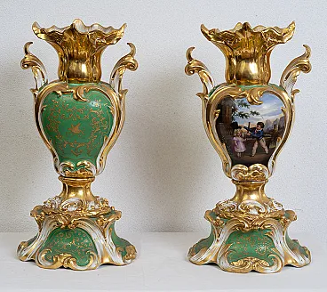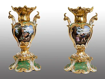 Pair of antique Louis Philippe vases in polychrome porcelain depicting romantic scenes. France 19th century.