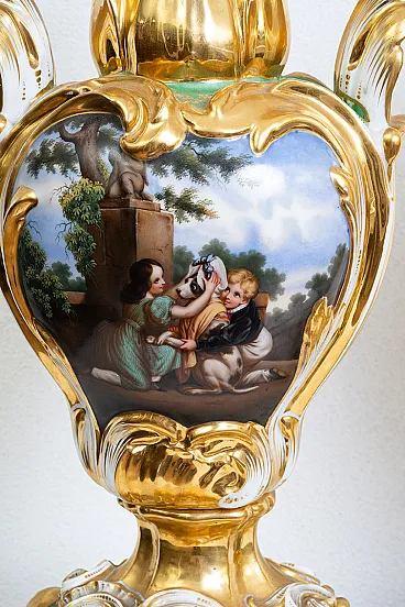 Description: Pair of antique Louis Philippe vases in polychrome porcelain depicting romantic scenes.