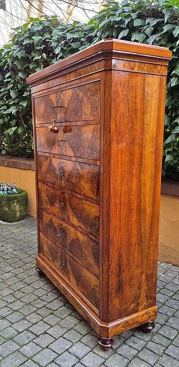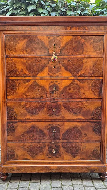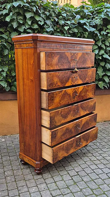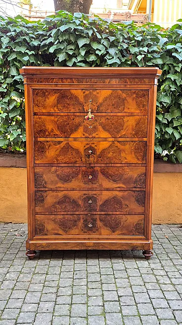 Romagna chest of drawers in walnut burl, 19th century