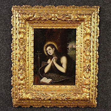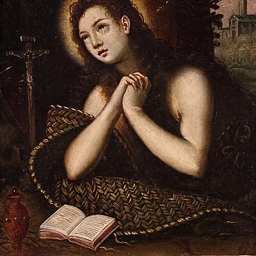 Venetian school of the first half of the 17th century. Oil on copper work depicting the penitent Saint Mary Magdalene, an intense and fascinating subject. The Saint is generally identified with the penitent harlot described in the Gospel of Luke and according to the Golden Legend she retreated to pray in a cave in France.