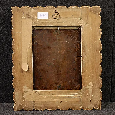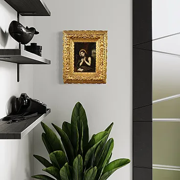 A highly evocative painting, ideal for collectors of sacred paintings from the high period and perfect for small reception rooms and professional studios with a cultured taste. 20th century frame in carved and gilded wood, beautifully decorated, with some small defects. Work that shows some signs of aging, overall in good state of conservation. Painting light H 18.5 x W 14 cm.