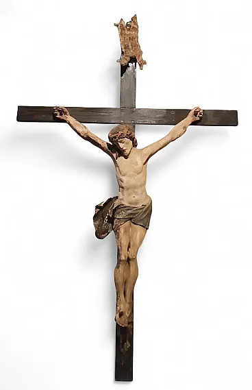 Style and iconography: Christ is depicted in the style of Christus Patiens (Suffering Christ), with his head bowed, his eyes closed or half-closed, and a knotted loincloth (cloth) covering his hips and legs. This iconography developed widely from the 13th century onwards, emphasising the humanity and suffering of Jesus.
