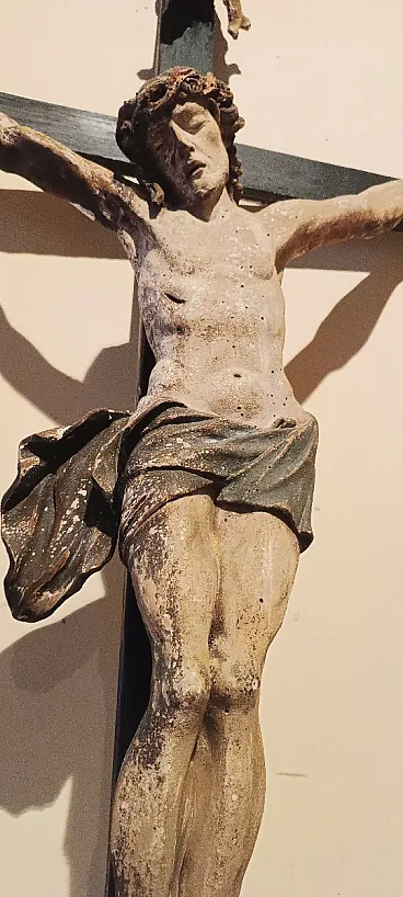 Anatomical details: The attention to anatomical details, such as visible ribs and musculature, suggests a thorough study of the suffering human body, common in Baroque and late Renaissance schools of sculpture. Condition: The sculpture shows signs of wear and tear, visible through the loss of paint (polychromy) and some minor damage, such as the absence of a finger on the right hand, typical of well-preserved but worn early works.