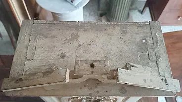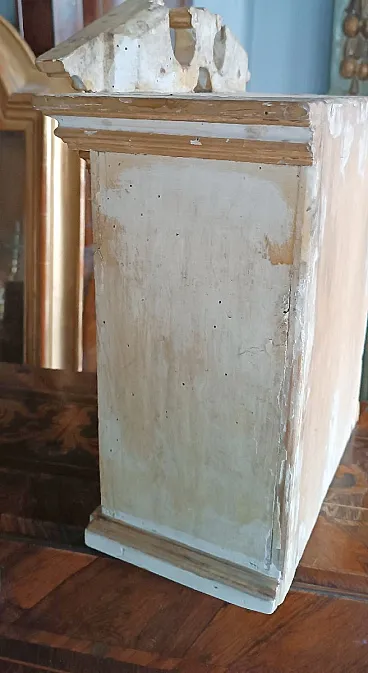 Style and period: The architectural style, with its side columns and scrollwork decoration, suggests an Italian origin (probably Tuscan) dating back to the 18th century.