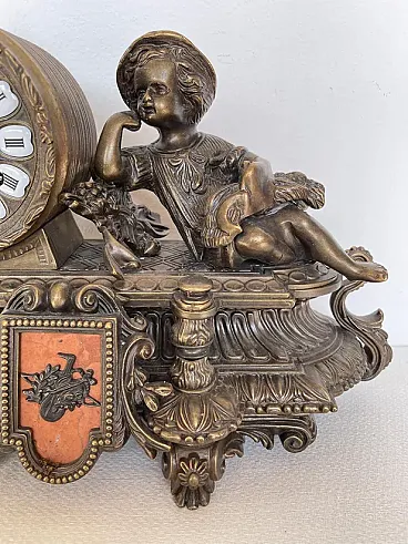 Fascinating French mechanical table clock from the 1970s, made of metal with an antiqued golden finish, characterized by a richly decorated composition and a strong scenographic impact. The clock features a circular dial with Roman numerals on light scrolls, framed by an ornamental structure with leaf motifs and classic details. On the right side, a finely modeled figure of a reclining cherub stands out, which gives visual balance and recalls the classic aesthetics of Baroque inspiration.