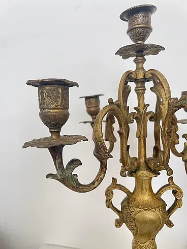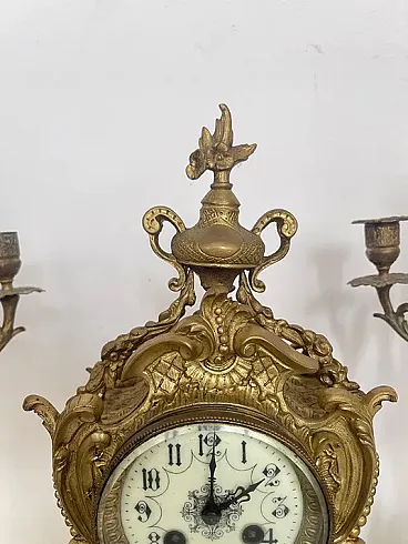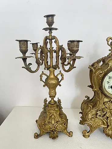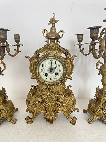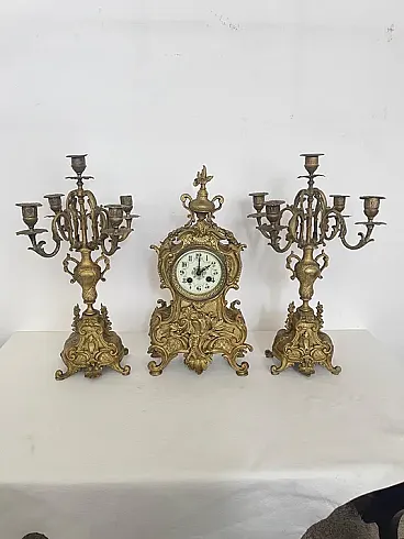 The two candelabra, symmetrical and coordinated, show a slender structure with multiple candle holder arms, connected by elegant curves and decorative details consistent with the clock. The set is designed to be placed on fireplaces, sideboards, consoles or representative furniture, becoming a focal point of the environment. The triptych is in good general condition, with a patina of time consistent with its age which enhances the gilding and underlines the authenticity of the whole.