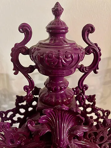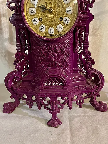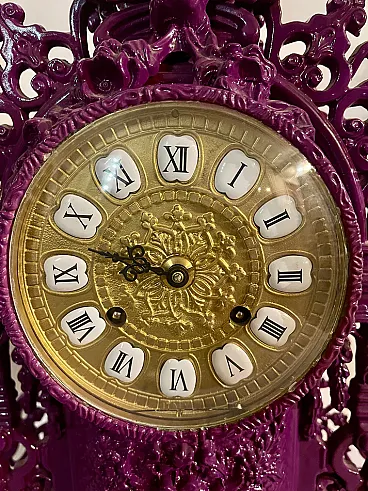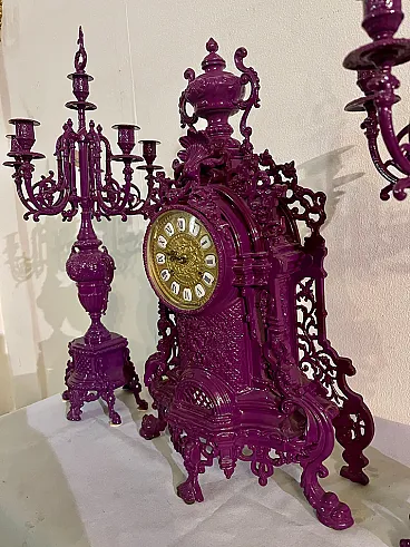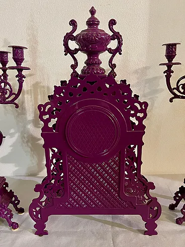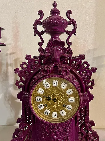 Spectacular decorative triptych in Baroque style, composed of a central mechanical clock and a pair of matching candlesticks, characterized by an intense purple finish that reinterprets the classic ornamental language in a contemporary key. The watch features a richly perforated case with scrolls, floral motifs and three-dimensional details, while the circular dial with Roman numerals creates an elegant chromatic and visual contrast with the structure.